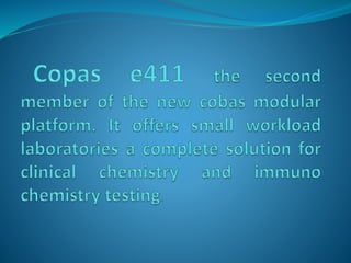 Roche introduces the cobas brand for laboratory products including clinical chemistry, immunochemistry, data management, coagulation analysis, urinalysis, and PCR-based testing. The cobas e 411 analyzer uses electrochemiluminescence technology to perform up to 88 tests per hour with sample volumes as low as 10-50μL. It offers rapid STAT results in as little as 9 minutes through random access testing on either a sample disk or rack system.