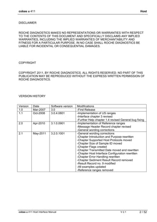 This document describes the host interface specifications for the Roche Diagnostics cobas u 411 analyzer. It supports the ASTM plus and ASTM Urisys 2400 host protocols. The interface allows for transmission of test results and other data between the analyzer and a host system via an RS-232 serial connection. The document provides details on the communication structure, data records, and examples of data transmissions for each supported protocol.