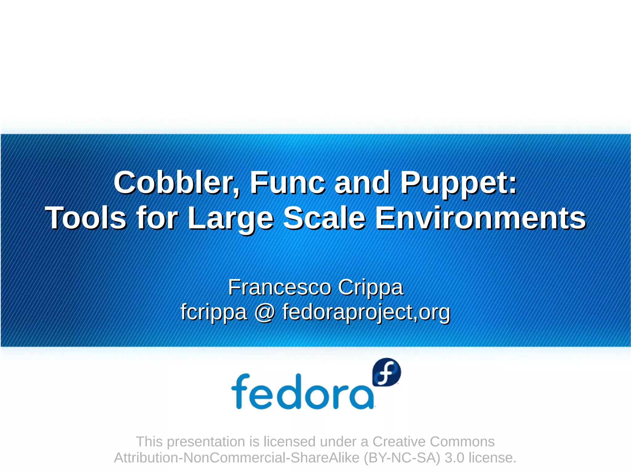 This document discusses tools for managing large scale computing environments: Cobbler, Puppet, and Func. Cobbler is a provisioning system that automates OS installation and configuration. Puppet is a configuration management tool that defines system configurations and ensures consistency. Func provides a Python API to manage systems, allowing them to be treated as Python objects. It includes modules to control services, run commands, and integrate with monitoring tools like Nagios. These tools help reduce complexity and enable consistent configuration of large numbers of systems.