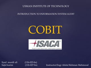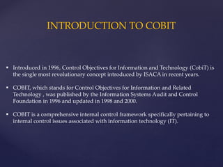 Cobit is a comprehensive IT governance framework introduced in 1996 by ISACA to help organizations ensure the integrity of information and information systems. It provides an IT governance model to help deliver value from IT while understanding and managing IT risks. The purpose of Cobit is to provide management and business owners with an IT governance framework to bridge gaps between business needs, controls, and technical issues. It offers benefits like more effective IT support of business goals, transparent IT costs, timely information, successful projects, and risk management.