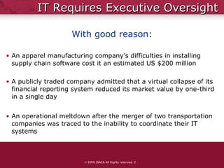 COBIT is a framework for IT governance and management. It provides tools and guidance to help executives ensure IT is aligned with business objectives and delivering value. COBIT defines processes, goals, and metrics for IT activities to optimize value, manage risks, and measure performance. It harmonizes other standards like ITIL and ISO and is used globally by organizations to improve IT governance.