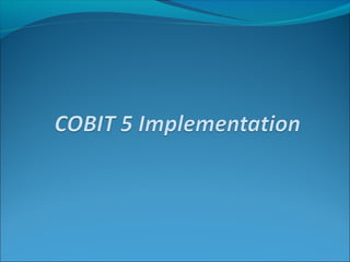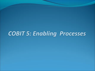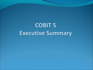 COBIT 5 provides a comprehensive framework to help enterprises effectively govern and manage enterprise information and technology. It includes five principles: meeting stakeholder needs, covering the enterprise end-to-end, applying a single integrated framework, enabling a holistic approach, and separating governance from management. The framework also identifies seven enablers that influence whether governance and management of IT will be successful, including processes, organizational structures, culture, policies, information, infrastructure, and people skills. COBIT 5 aims to help enterprises optimize value from IT investments by balancing benefits realization with risk management and resource optimization.