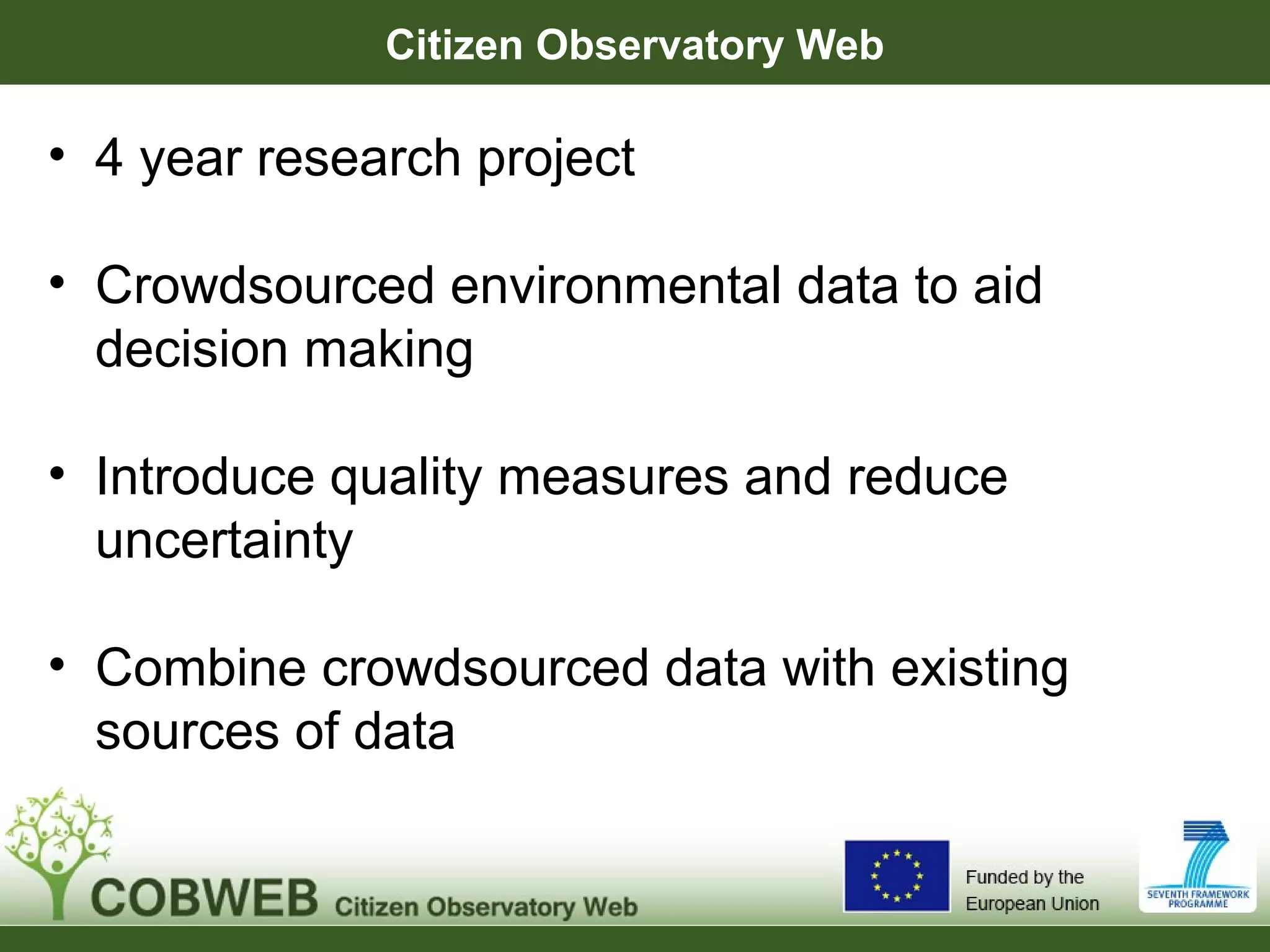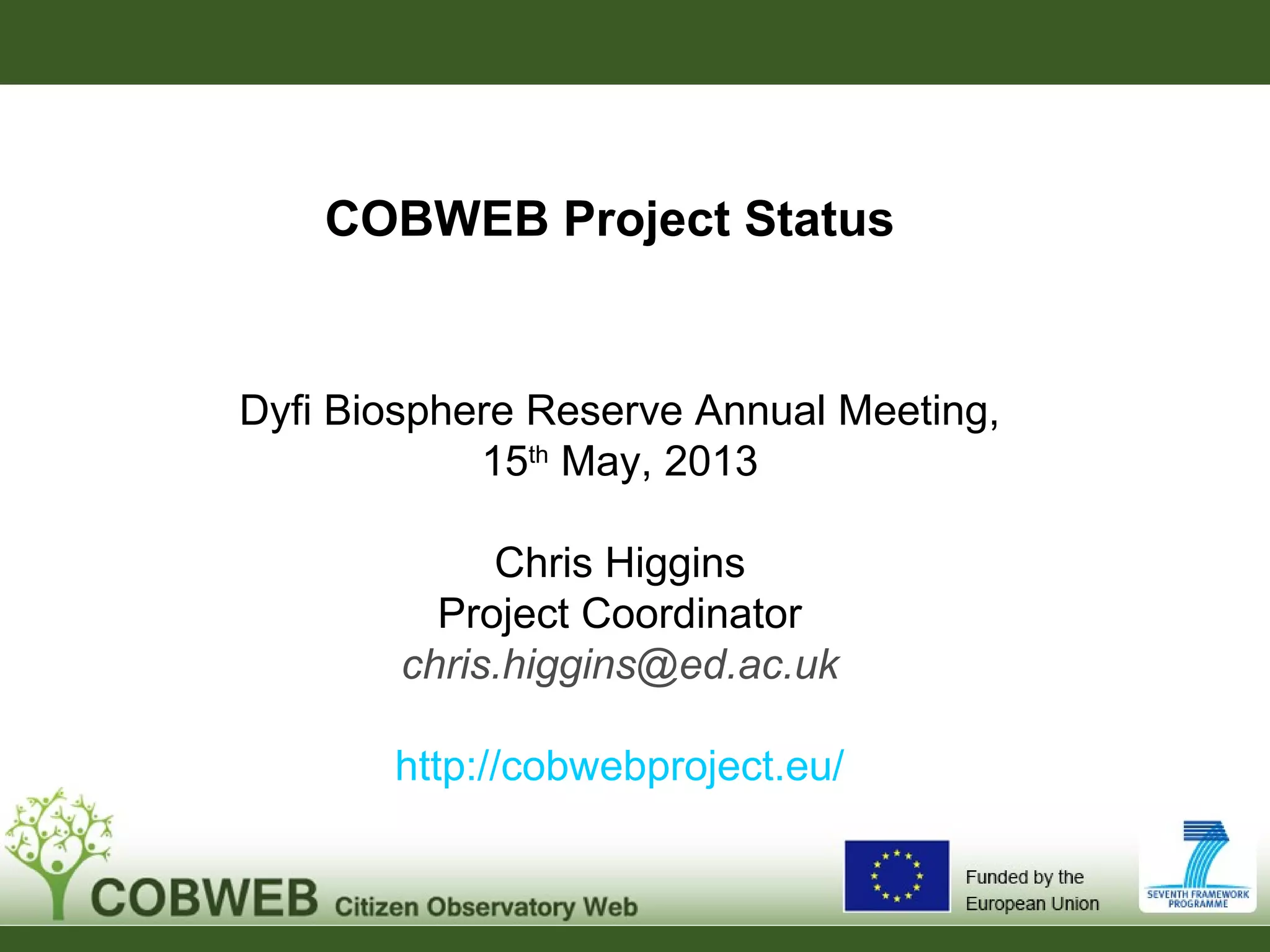 The COBWEB project, presented at the Dyfi Biosphere Reserve annual meeting, focuses on crowdsourced environmental data to enhance decision-making and engage local volunteers in citizen science. It aims to develop mobile applications in areas such as earth observation, biological monitoring, and flooding while fostering community involvement and raising the profile of the Dyfi area. The project seeks input on volunteer motivations and awareness to enhance its impact and understand potential citizen science projects.