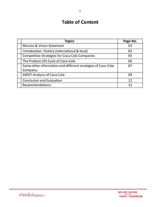 Coca-Cola has been operating in Pakistan since 1953 and established Coca-Cola Beverages Pakistan Limited in 1996 to acquire all bottling plants. CCBPL plays a key role in maintaining quality and ensuring availability of Coca-Cola brands in Pakistan. The company focuses on differentiation and cost focus competitive strategies. It also emphasizes product improvement and expanding distribution channels to extend its product lifecycle in the maturity stage. Coca-Cola follows both local employment laws and its international Code of Business Conduct.