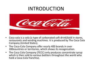 Coca-Cola is a globally recognized carbonated soft drink sold in over 200 countries. It was invented in 1885 by John Pemberton and was first sold in 1886. The Coca-Cola Company owns hundreds of beverage brands worldwide and only produces syrup concentrate, which is sold to franchised bottlers who produce and distribute the final beverages. Coca-Cola has experienced significant growth over the past century and a half, developing popular advertising campaigns and expanding globally to become the largest beverage company in the world.