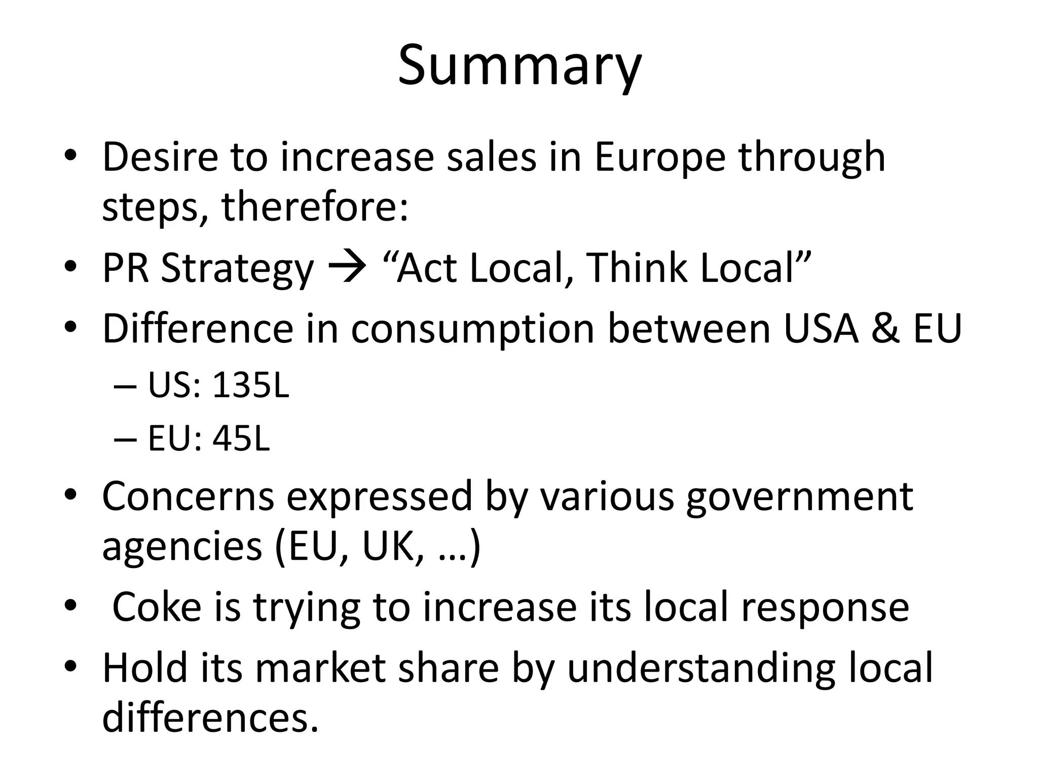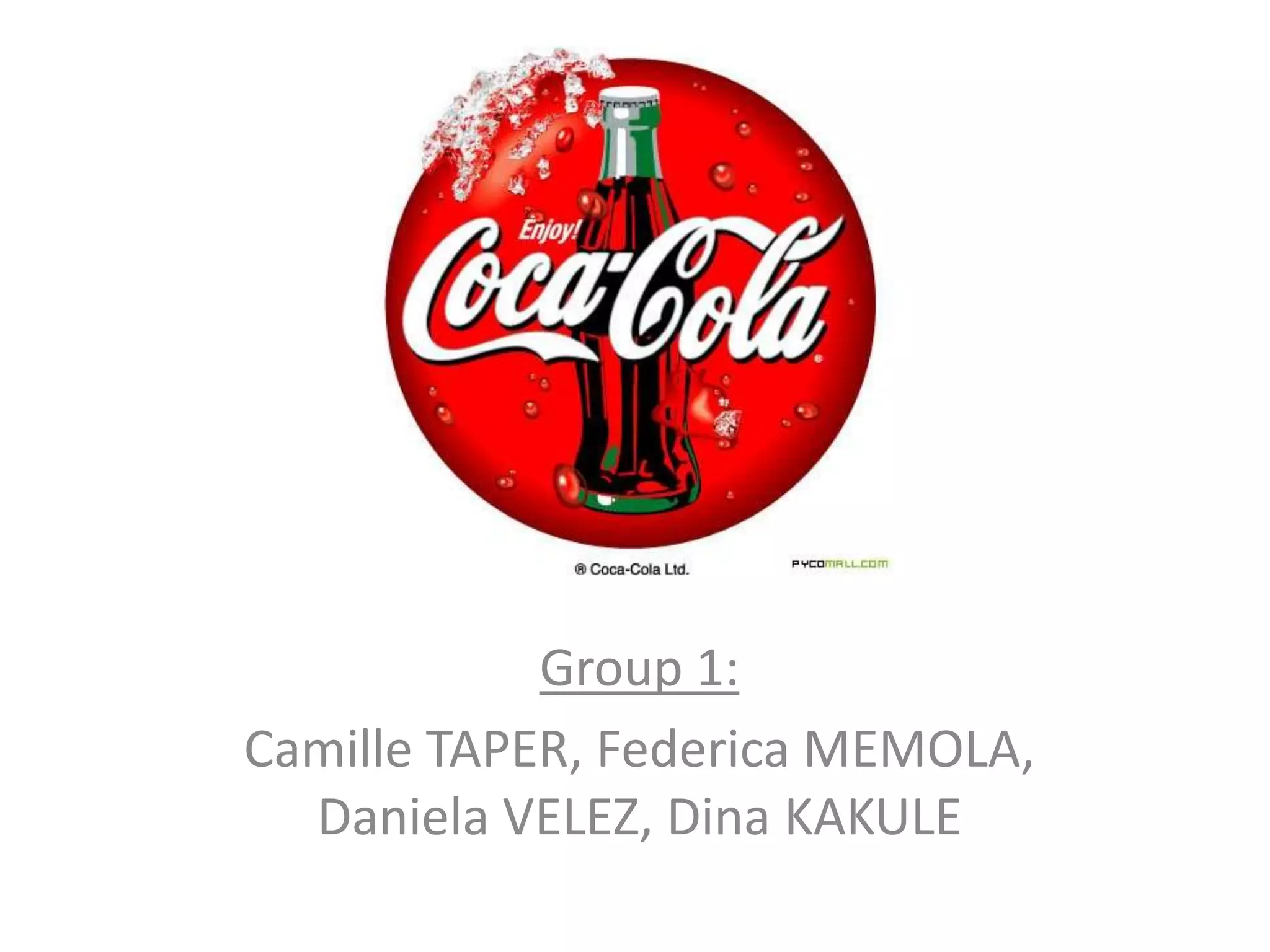 Group 1 analyzed Coca-Cola's strategy to increase sales in Europe. To do so, Coca-Cola engaged in foreign direct investment by building production facilities closer to European markets to lower costs. It also improved local factor conditions by replacing franchisers with local sellers, increasing advertising, and lowering prices. Coca-Cola modified its strategy in response to local rivalry by focusing on non-carbonated drinks, local tastes, and the "Think Local, Act Local" approach. As a result, Coca-Cola operates as a multinational enterprise through country-specific strategies and international partnerships rather than being dominated by one home region.