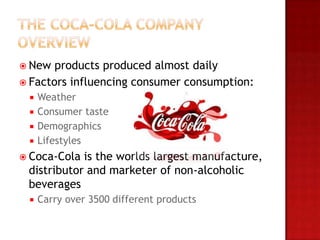 Coca-Cola is the world's largest manufacturer and distributor of non-alcoholic beverages, holding a 45.84% market share over recent years with over 3500 products. The competitive landscape includes major players such as Pepsi and Nestlé, with ongoing innovations and joint ventures like Tata Water Plus showing market adaptability. Despite its strong position, Coca-Cola faces pressures from rivals, market demands for healthier options, and environmental sustainability initiatives.