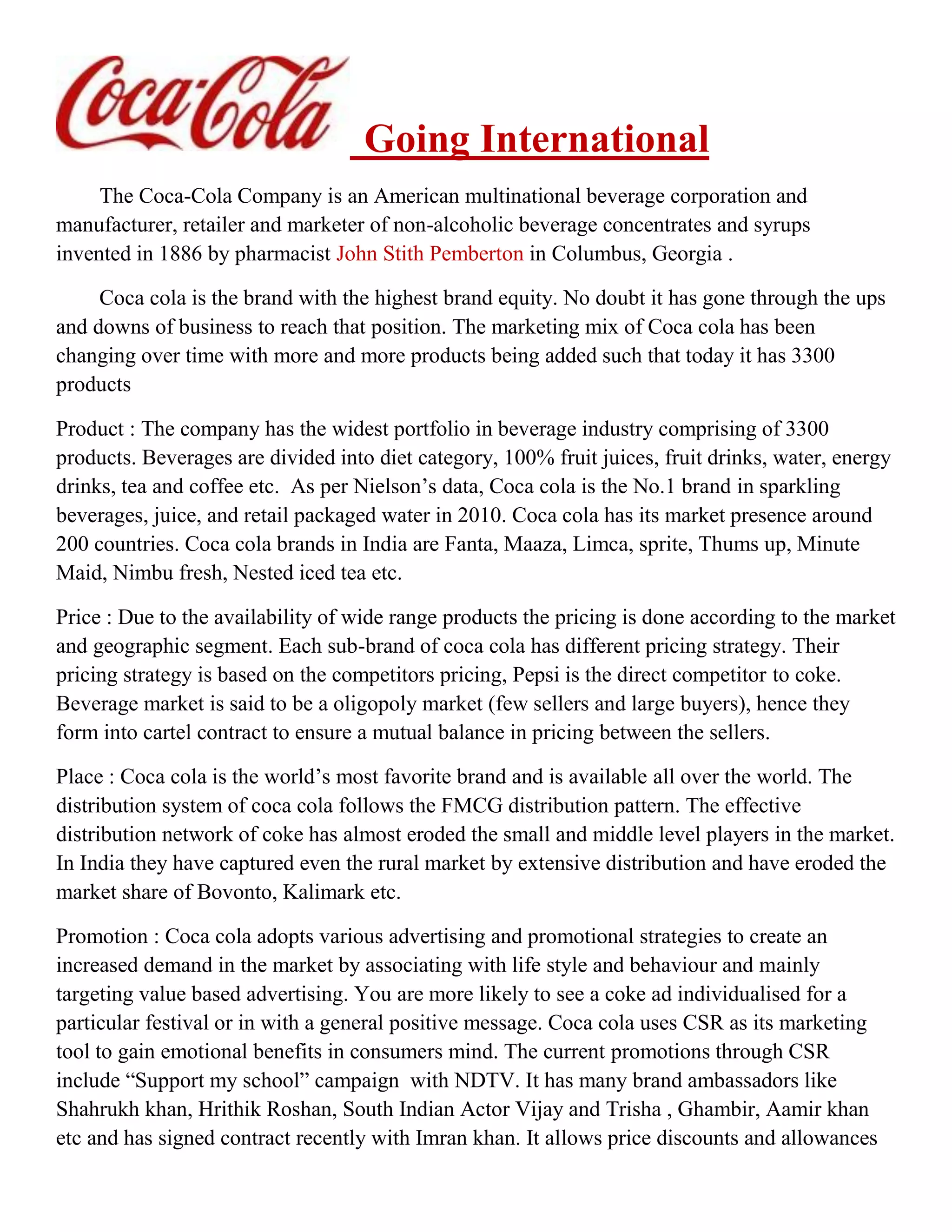 Coca-Cola is one of the most globally active international companies, deriving 80 percent of its sales from outside the U.S. To succeed internationally, Coca-Cola had to understand that different markets require different marketing strategies and relationship building. In India, Coca-Cola changed its slogan when it learned soft drinks were reserved for guests. In Japan, Diet Coke was renamed Coke Light to avoid embarrassment. In Spain, brown delivery trucks were repainted because they resembled hearses. In Germany, delivery uniforms were altered since brown shirts carried negative associations. Coca-Cola's ability to adapt its marketing to local cultures enabled its global success.