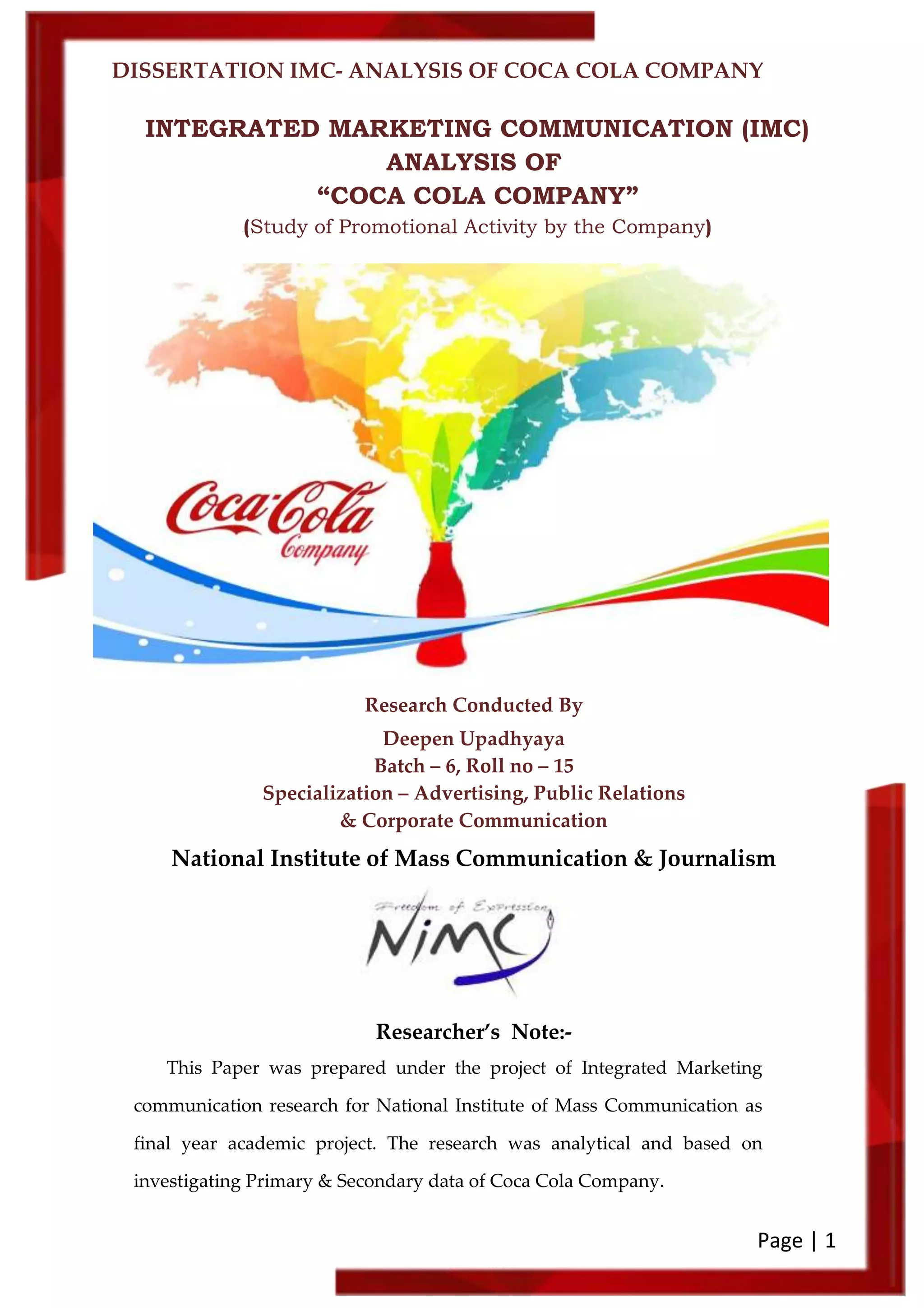 This dissertation analyzes the integrated marketing communication (IMC) strategies of the Coca-Cola Company, focusing on their promotional activities and the effectiveness of various communication tools such as advertising and public relations. The research utilizes both primary and secondary data to evaluate how Coca-Cola has effectively integrated these strategies to enhance brand image and customer relationships in the Indian market. The paper aims to demonstrate the importance of a unified marketing message and its impact on sustaining brand equity.