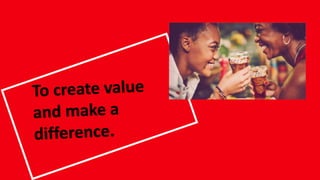 This document provides an overview of The Coca-Cola Company. It discusses that Coca-Cola was invented in 1886 and the company was incorporated in 1894. The Coca-Cola Company manufactures syrup concentrate which is then sold to bottlers who hold exclusive territories. It also discusses Coca-Cola's vision, mission, and marketing strategies including their wide product portfolio, aggressive promotion activities, geographic-based pricing, and extensive distribution network which has helped them achieve a 48.6% global market share.