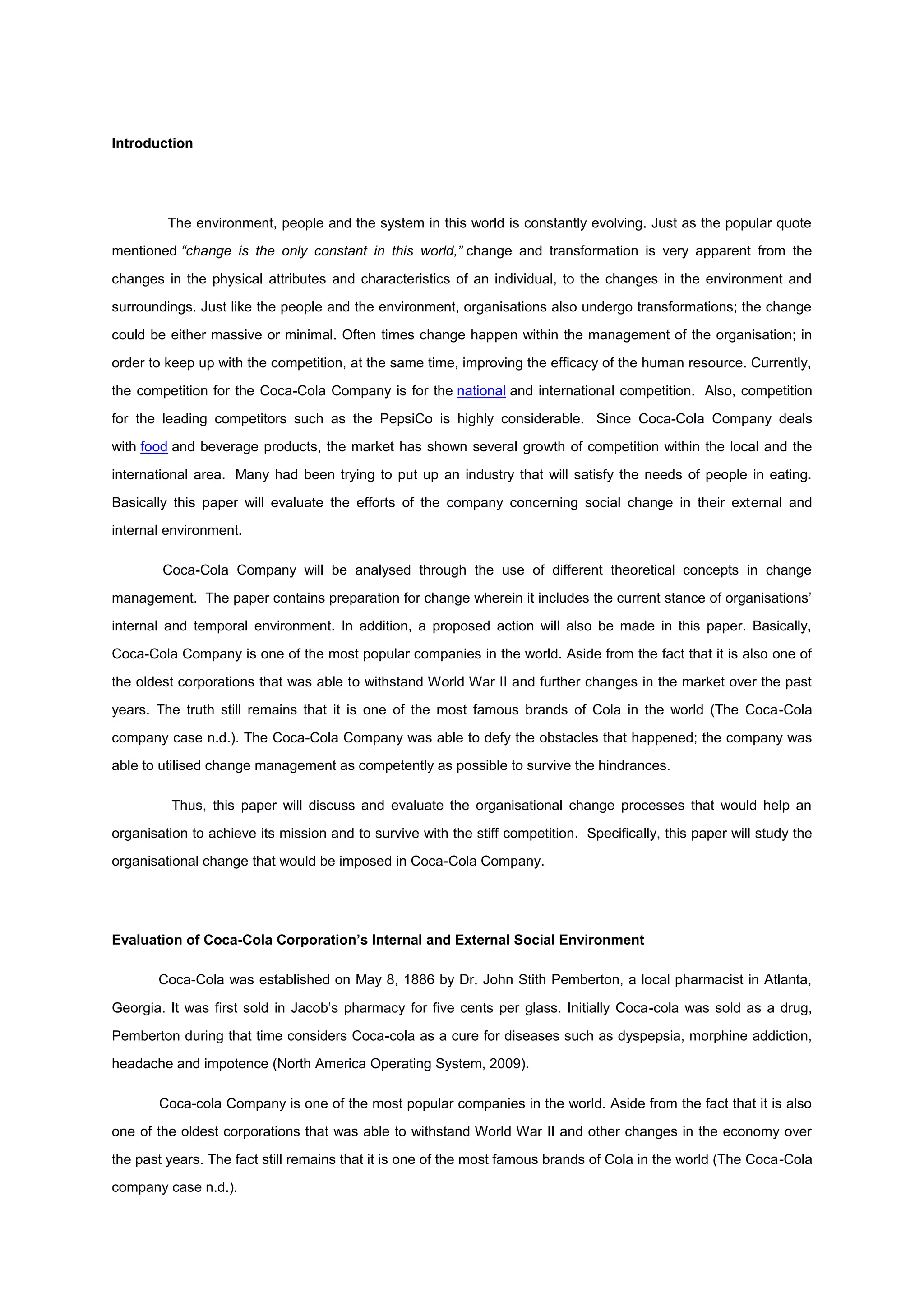 The document discusses organizational change at Coca-Cola Company. It provides background on Coca-Cola's founding and success over decades. It analyzes Coca-Cola's internal and external environments, noting how the company responded to various challenges like wars, health trends, and financial crises through innovation, new products, and acquisitions. The document recommends renewing Coca-Cola's systems and structures in Hong Kong to increase efficiency using a machine bureaucracy model. It also suggests ways to overcome employee resistance to change through education, participation, support, negotiation, and co-option.
