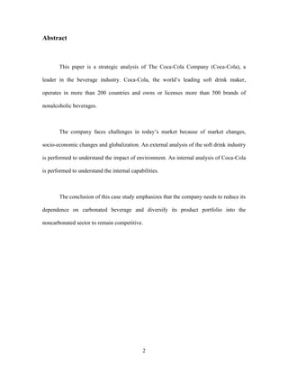 This document provides a case study analysis of The Coca-Cola Company. It includes an introduction outlining Coca-Cola's mission, products, and history. Sections 2 and 3 provide an internal and external analysis, covering Coca-Cola's strengths as industry leader but also weaknesses like negative publicity and lack of diversification. The document concludes that Coca-Cola needs to reduce reliance on carbonated drinks and expand into non-carbonated options to remain competitive against trends like health concerns and increased competition from PepsiCo.