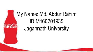 This presentation provides information about Coca-Cola and its operations in Bangladesh. Coca-Cola is produced by The Coca-Cola Company and is the world's largest beverage company and most valuable brand. It has been marketed in Bangladesh for 50 years by Abdul Monem Limited under authority from Coca-Cola USA. While Coca-Cola faces challenges like changing consumer preferences, it plans for the future by increasing marketing investments and improving its bottling system. The presentation concludes with the Coca-Cola brand logo.