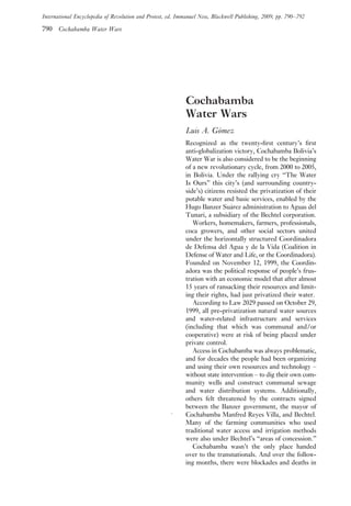 The Cochabamba Water Wars were a series of protests in 2000 in Cochabamba, Bolivia against the privatization of the city's water supply. The privatization led to massive rate increases of up to 1000%, threatening people's access to water. Various social groups united in the Coordinadora de Defensa del Agua y de la Vida to oppose the privatization. Through months of demonstrations, road blockades, and clashes with police, the Coordinadora successfully pressured the government to revoke the contract with private water company Aguas del Tunari. The protests marked a major victory against neoliberal economic policies and globalization, and bolstered popular participation in politics in Bolivia.