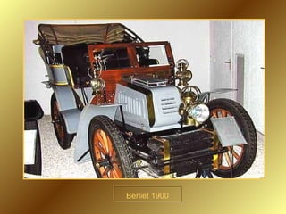 The document lists various automobile models from 1900 to 1939, including brands such as Berliet, Oldsmobile, Cadillac, Ford, Rolls Royce, Duesenberg, Mercedes Benz, Bentley, Bugatti, MG, and Aston Martin. Years range from 1900 to 1939 and models include touring cars, roadsters, sedans, limousines, and convertibles. The document appears to be a chronological listing of automobile models from early automotive history showcasing various luxury brands.