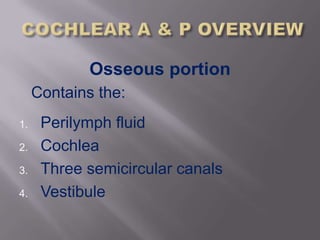 The inner ear is composed of an osseous portion containing fluid and structures like the cochlea and semicircular canals, and a membranous portion containing additional fluid and structures such as the saccule and utricle. The inner ear consists of the vestibular portion for balance and the cochlear portion for hearing, with the cochlea being a spiral shaped structure that converts sound into electrical signals through hair cells. The cochlea contains three fluid filled canals and uses traveling waves that vary in amplitude at different points along the basilar membrane to detect different frequencies of sound.