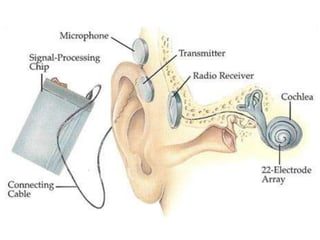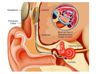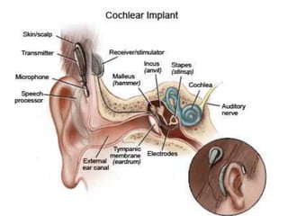 Cochlear implants are surgically implanted devices that provide a sense of sound to those who are profoundly deaf or severely hard of hearing by bypassing damaged portions of the ear to directly stimulate the auditory nerve. They consist of an external portion containing a microphone, speech processor, and transmitter, and an internal portion containing a receiver, stimulator, and electrodes array. Cochlear implants are ideal for those with severe-to-profound deafness in both ears who have functioning auditory nerves but do not benefit from hearing aids. Risks include wound healing issues, infections, and device malfunctions.