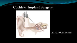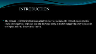 This document provides an overview of cochlear implants, including: