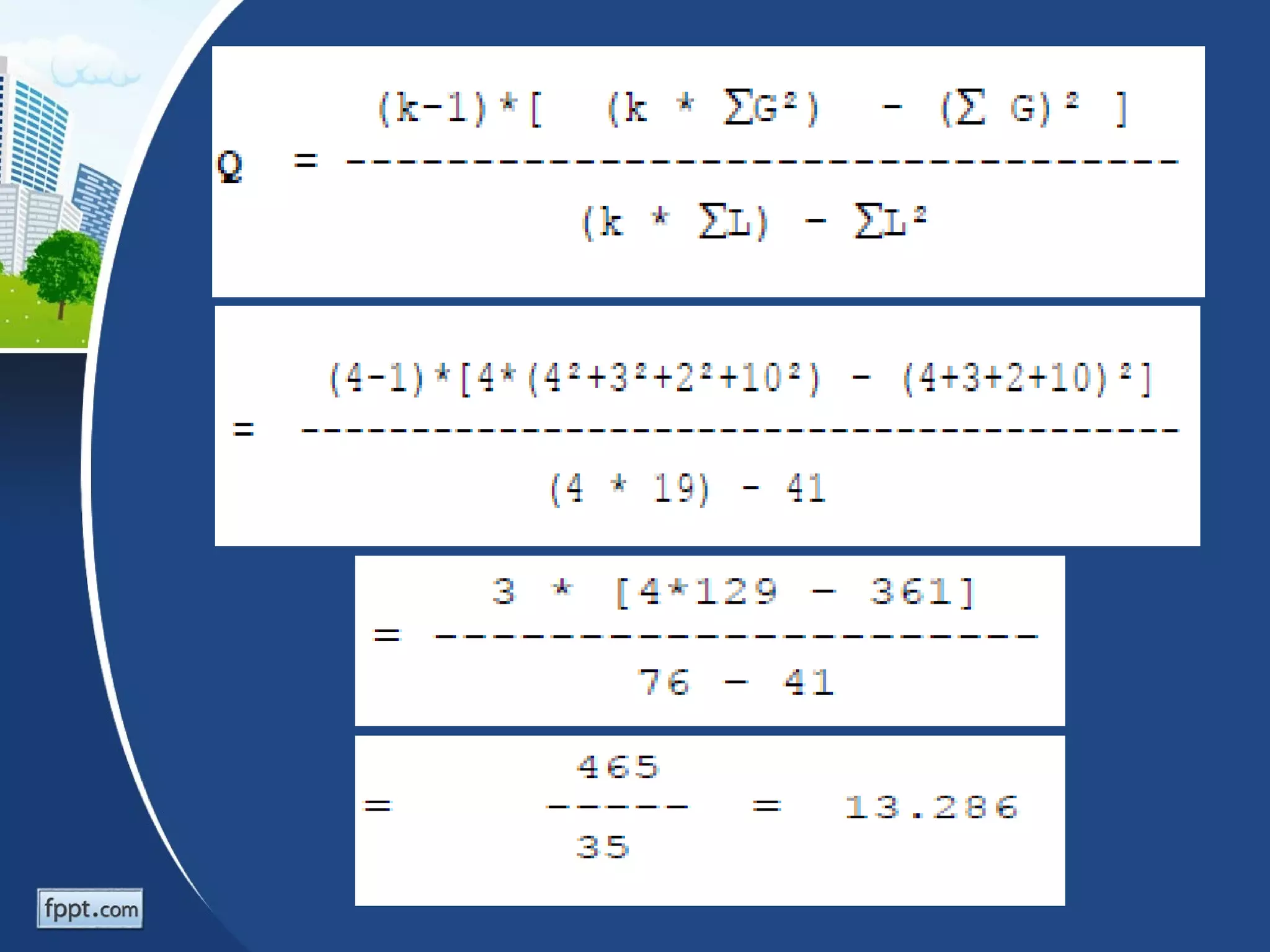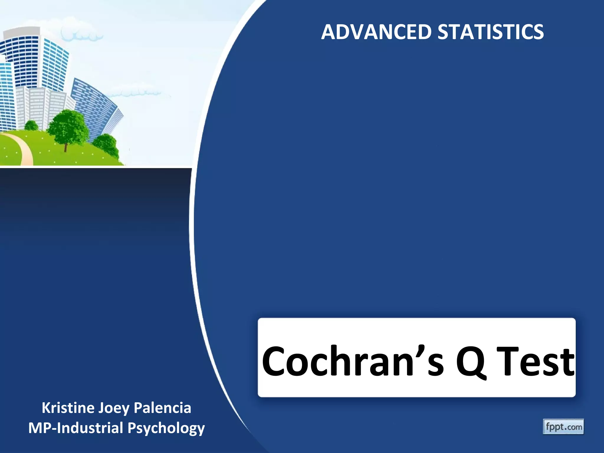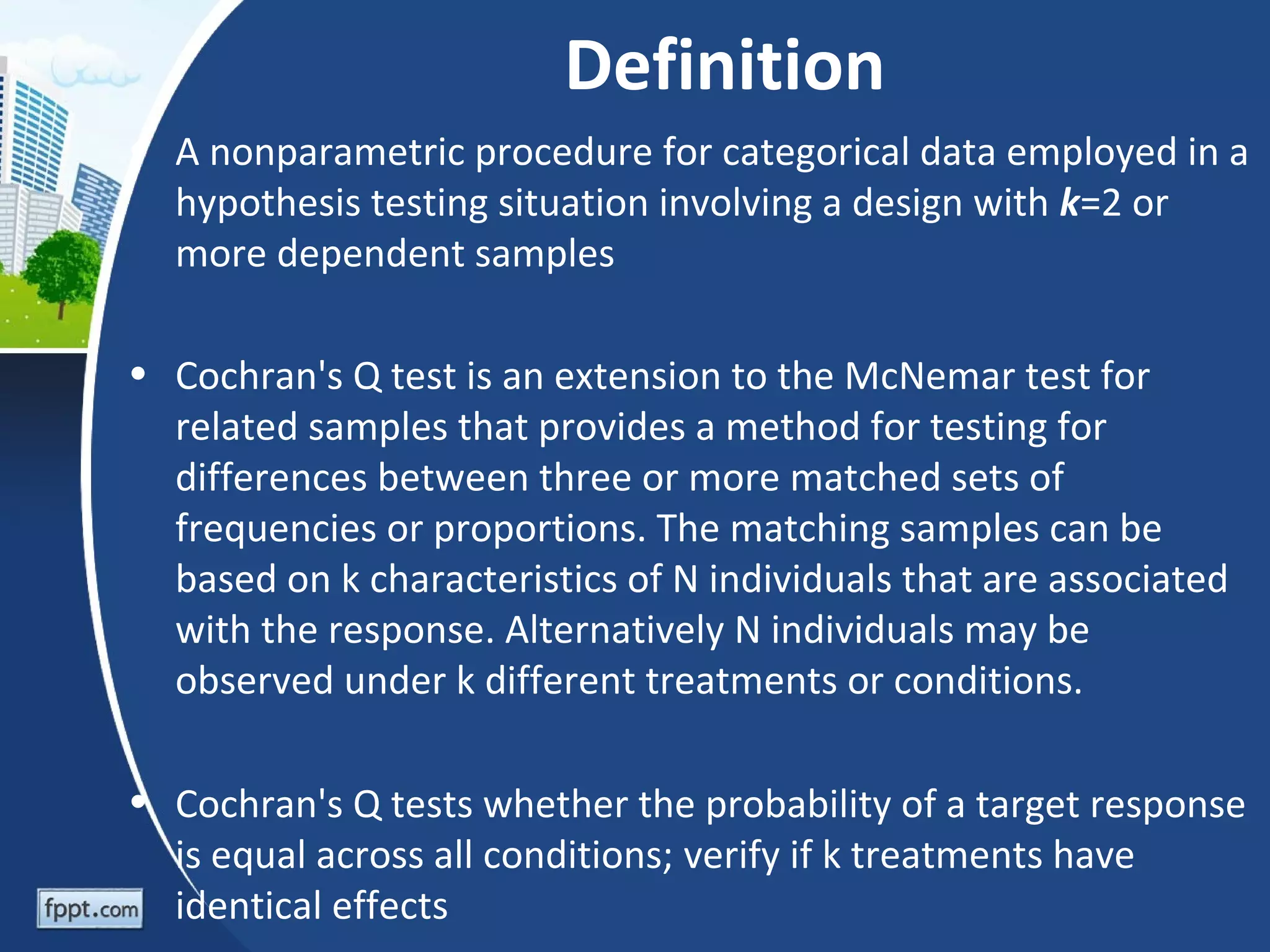 Cochran's Q test is a nonparametric test used to compare dependent categorical variables across three or more conditions. It is an extension of the McNemar test for related samples. The test compares the probability of a target response across different conditions to see if treatments have identical effects. It assumes a large sample size and that blocks were randomly selected. An example uses data from pet stores to test if they are equally likely to display both reptiles (snakes and lizards) during different times of the year. The Cochran's Q test rejects the null hypothesis, finding stores were more likely to display both during Christmas than other times.