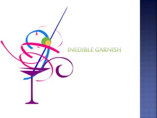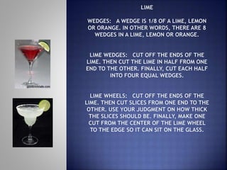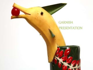 The document discusses different types of cocktail garnishes. It states that garnishes are important for mixed drinks as they make drinks more presentable and add flavor. It lists six main garnishes - maraschino cherries, stuffed olives, lime wedges, lemon wedges, orange slices, and whipped cream. It then provides instructions and photos for less common garnishes using various fruits and vegetables like apples, bananas, berries, pineapple, and strawberries.