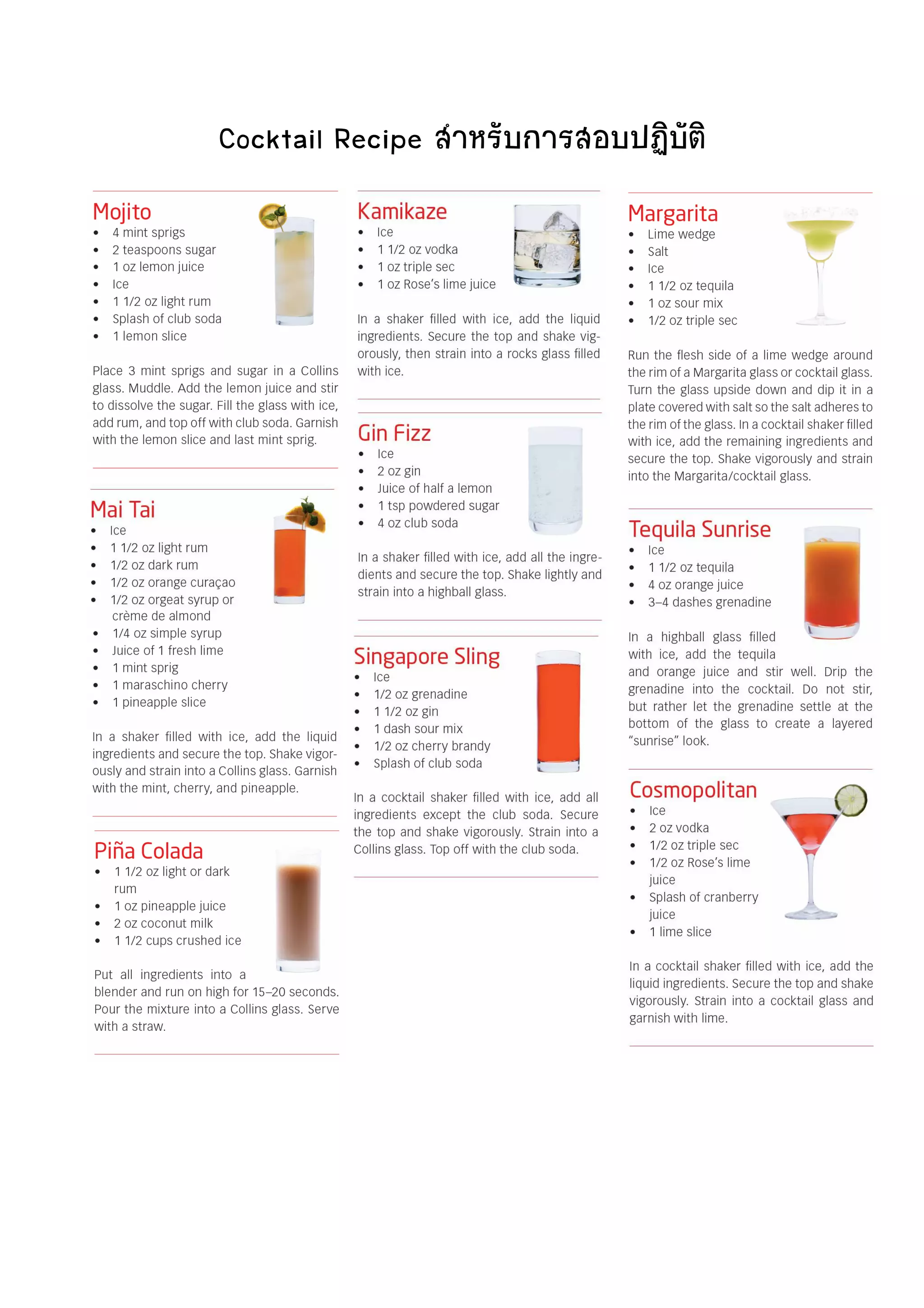 Cocktail Recipe ที่ใช้สอบปฏิบัติ 10 สูตร