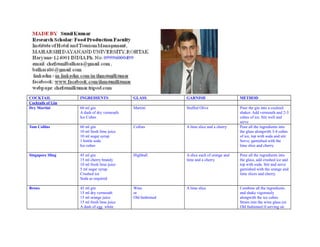 The document provides recipes for various cocktails including gin, rum, vodka, whiskey and tequila cocktails. It lists the ingredients, measurements, glass type and garnish for each cocktail. The recipes also include instructions for mixing and serving the cocktails. There are a total of 30 different cocktail recipes summarized.