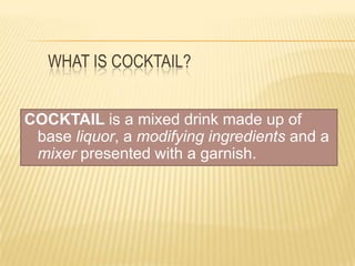This document provides information on cocktails and bartending. It defines a cocktail as a mixed drink made with a base liquor, modifier, and mixer. It describes the three elements of cocktails and provides examples. It also classifies cocktails into categories such as international, tropical, classic, shooters, and mocktails. The document outlines different types of cocktails like pre-dinner drinks, after dinner drinks, long drinks, and fancy drinks. It discusses alcoholic and non-alcoholic ingredients and substitutes. Finally, it provides procedures for making common garnishes like oranges, pineapples, apples, limes, and cherries.