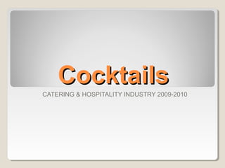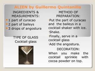 This document provides recipes for 14 cocktails. Each recipe includes measurements for ingredients, preparation instructions, and decoration suggestions. The cocktails use spirits like rum, tequila and whiskey along with mixers like juices, liqueurs and sodas. Preparation typically involves mixing ingredients in a shaker with ice and straining into a glass. Decorations range from fruit slices to sugar rims to sprinkles of cocoa powder.