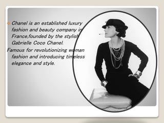 Chanel is a luxury fashion and beauty company founded in France in 1909 by Gabrielle "Coco" Chanel. It is known for its timeless elegance and style in clothing and accessories. Chanel specializes in haute couture and luxury goods like suits, dresses, handbags, and jewelry. The company strives to define style and create desire through its functional yet elegant designs. It is now jointly owned by the Wertheimer family and operates over 200 boutiques worldwide.