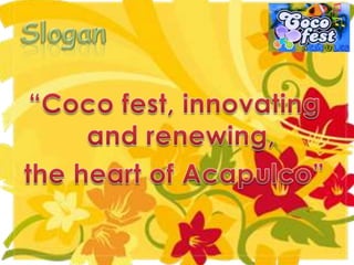 The document outlines conservation plans for Acapulco, Mexico. A team proposes creating "Coco Fest", a festival showcasing coconuts and music, to boost tourism and the economy in Acapulco. Analyzing how Acapulco has changed from the past, important events like the Mining Expo have left or disappeared. Coco Fest would help renew Acapulco by celebrating coconuts, a locally abundant fruit, and attracting visitors back to the city's beaches.