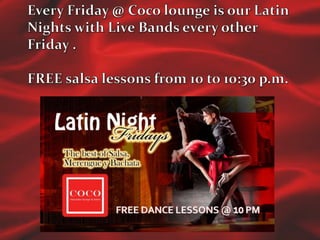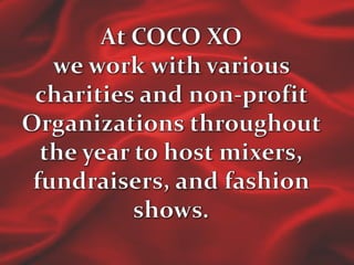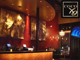 This document advertises event planning and party services from COCO XO. It mentions hosting events from intimate gatherings of 6 to large parties of 1,000 people. It also lists Thursday night drink specials for Ladies Night, including $5 chocolate martinis, $5 coco cosmos, and $100 bottle service of Ciroc vodka. Fridays and Saturdays are also mentioned as event nights.