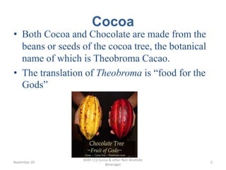 The document discusses cocoa and non-alcoholic beverages, detailing the cocoa tree’s growth locations, production process, and various products derived from cocoa beans, such as chocolate liquor and cocoa powder. It also covers the preparation of squashes, which are concentrated fruit pulps diluted with water, and syrups, a thick sugar-water concentration flavored with fruits or flowers. Additionally, examples of flavored syrups used in cocktails and mocktails are provided.