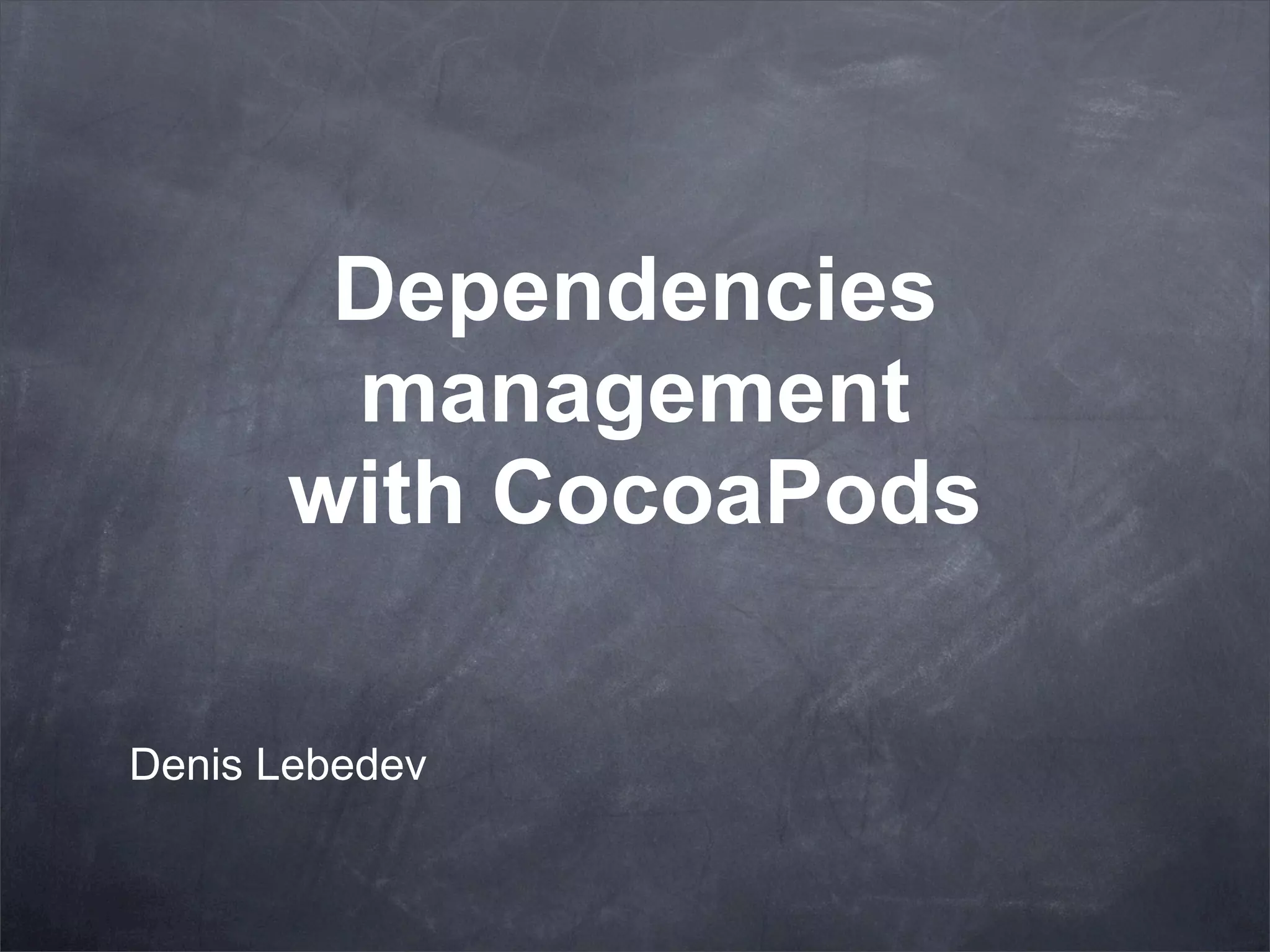 CocoaPods is a dependency manager for Cocoa projects. It allows you to specify library dependencies in a Podfile, and installs/updates those libraries and their dependencies. It works by generating an Xcode workspace that includes library source files and automatically configures build settings. CocoaPods manages library updates through a specification (podspec) file that describes each library and its dependencies.