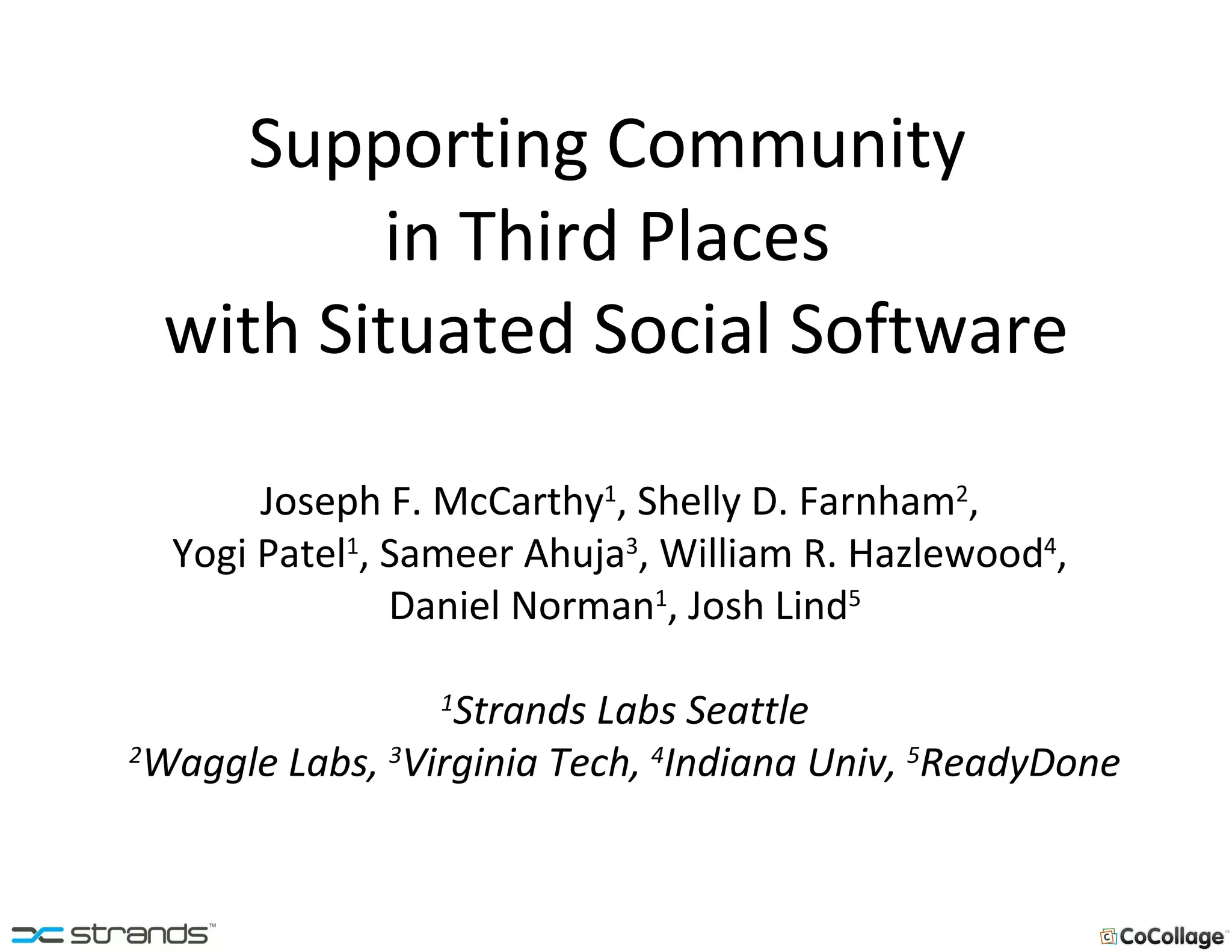 Supporting Community  in Third Places  with Situated Social Software Joseph F. McCarthy 1 , Shelly D. Farnham 2 ,  Yogi Patel 1 , Sameer Ahuja 3 , William R. Hazlewood 4 ,  Daniel Norman 1 , Josh Lind 5 1 Strands Labs Seattle 2 Waggle Labs,  3 Virginia Tech,  4 Indiana Univ,  5 ReadyDone