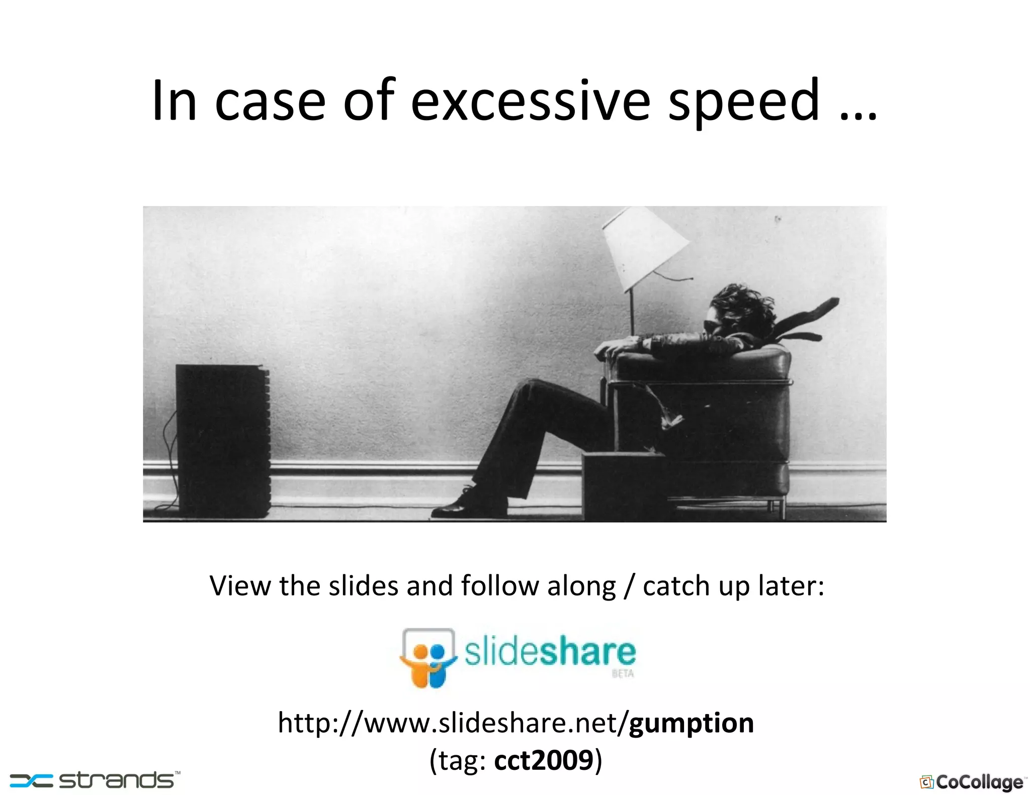 In case of excessive speed … http://www.slideshare.net/ gumption (tag:  cct2009 ) View the slides and follow along / catch up later: