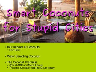 The document discusses coconuts and various coconut-related projects. It describes the global distribution of coconuts and introduces the CocoMake7 project, which aims to create a low-cost educational platform using coconuts and other local materials. The document also discusses projects involving coconut-based musical instruments and sensors, including a coconut theremin that uses capacitive sensing and an Arduino-powered water sampling coconut for collecting environmental data.