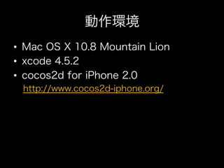 ティクルを表示する! • ps.autoRemoveOnFinish = YES;を忘れ ずに!これをYESにすると、パーティクル 消滅後自動的に終了処理が行われる! • ループ中の配列から値を消去するには、 removeObjectsInArrayを使おう!