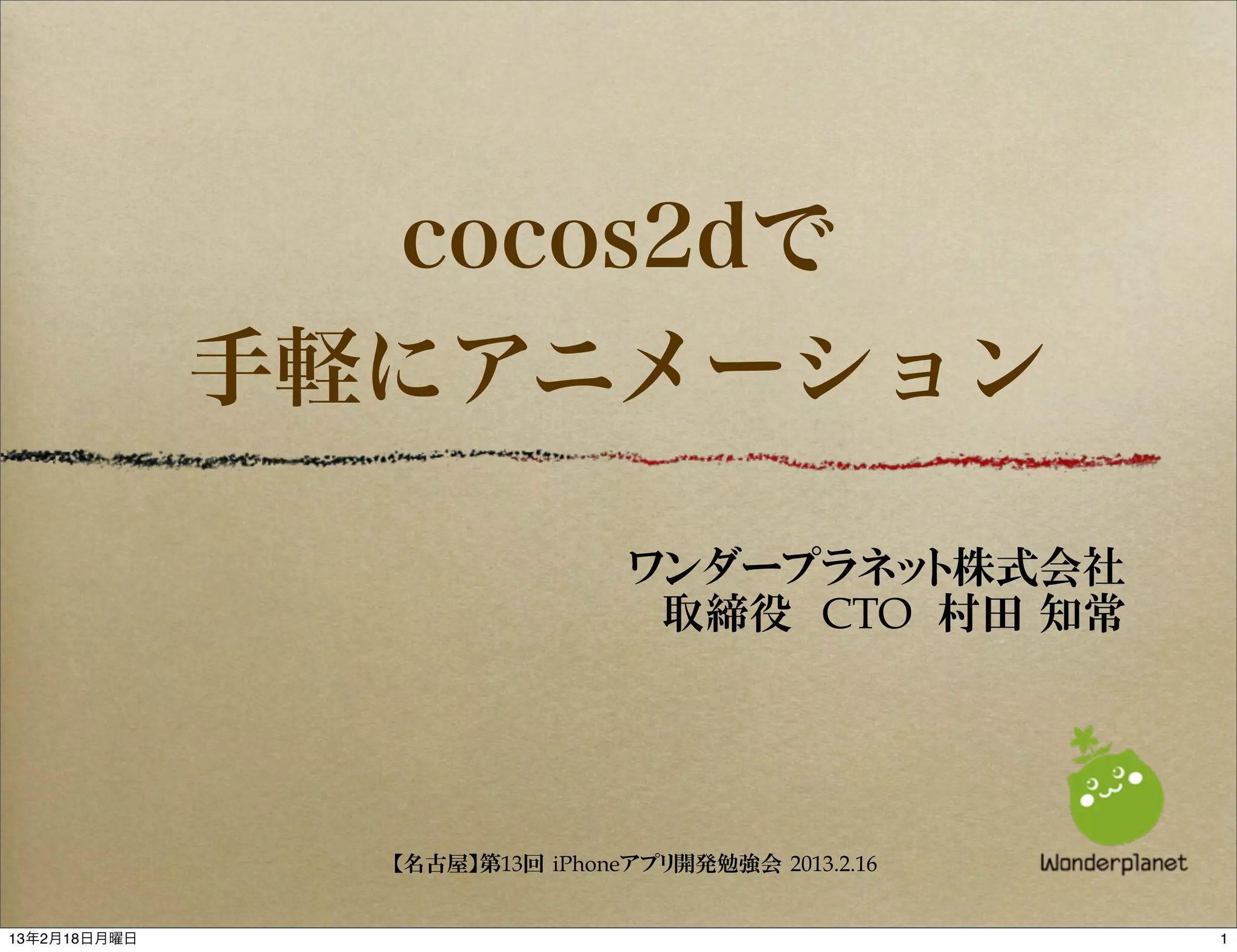 第13回 名古屋iPhone開発者勉強の発表で使った資料です。 cocos2dの基本アニメーションをまとめてあります。