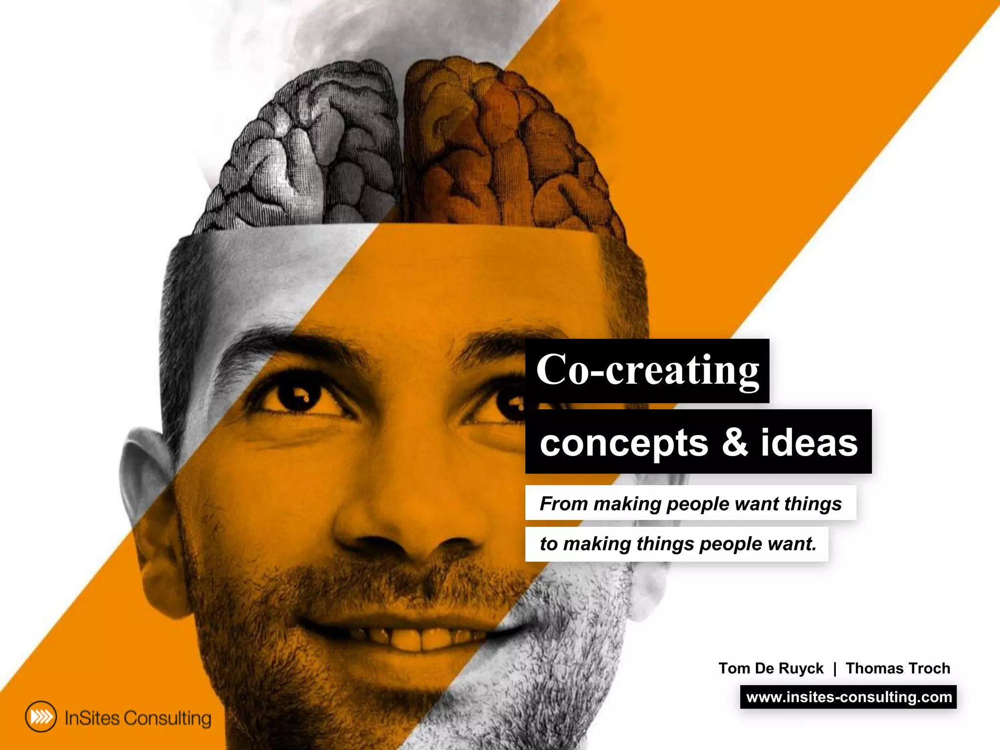 The document discusses co-creation concepts and ideas between companies and consumers. It notes that for every 4 projects that enter development at companies, only 1 makes it to the market, and at least 1 in 3 products fail despite planning and research. It advocates engaging consumers in the innovation process to develop things that people want by refining, redefining, competing with, and creating new categories. The document outlines a process for effective co-creation projects that includes defining objectives, selecting participants, briefing them, generating ideas in an online community, selecting the best ideas, and improving concepts through workshops.
