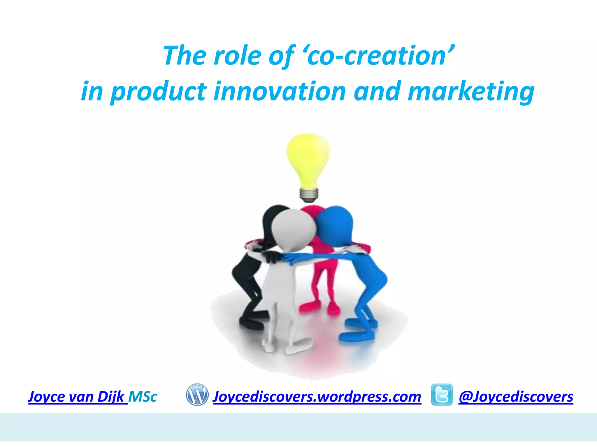 The document discusses the concept of co-creation, where companies systematically collaborate with consumers to develop or improve products. It provides definitions of co-creation, describes the motivations and roles of both companies and consumers in co-creation efforts. The document also summarizes interviews with co-creation practitioners, who discuss challenges of co-creation for companies, and the importance of both lead users and average consumers. Finally, it outlines an experiment that tested how different levels of a brand's co-creation efforts affected non-co-creating consumers' perceptions of the brand and product.