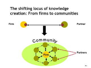 The document discusses the shift from traditional consumer models to consumer co-creation enabled by new technologies and user-generated content. It provides examples of companies like Procter & Gamble and Lego that have successfully engaged communities to gather feedback and co-create new products and innovations. It also outlines considerations for developing effective communities of creation, such as balancing order and openness, intellectual property management, and incentives for long-term user involvement.