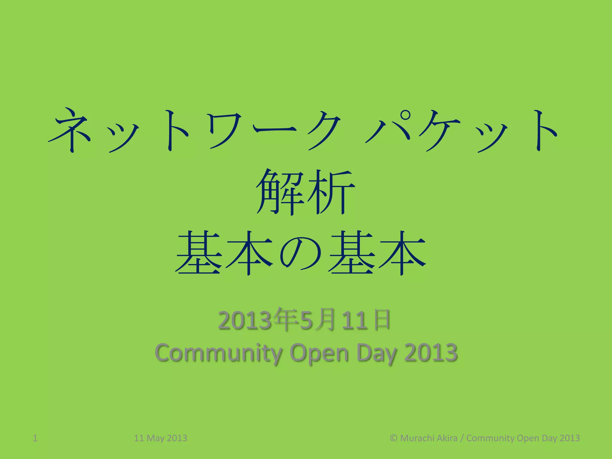 2013年5月11日開催 "Conunity Open Day 2013" のセッション「ネットワーク パケット解析 基本の基本」のスライドです。
