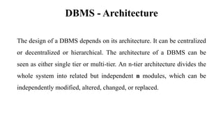 This document discusses database management system (DBMS) architecture and relational database management systems (RDBMS). It describes one-tier, two-tier, and three-tier architectures for DBMS. It also discusses database models including hierarchical, network, and relational models. Additionally, it covers RDBMS concepts such as tables, records, fields, columns, keys including primary keys and foreign keys. It provides examples to illustrate these concepts.