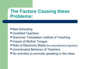 This document discusses problems faced by intermediate level English students in Pakistan and potential solutions. It identifies issues such as poor schooling, unskilled teachers, over reliance on grammar translation, influence of the native language, lack of engaging media and activities, and student lack of confidence. Specific linguistic difficulties are outlined, like variations in pronunciation of letters/letter combinations and silent letters. The document proposes remedies such as hiring qualified teachers, providing practice through media, adopting audio-lingual teaching methods, exploring word meanings, and establishing English speaking clubs.