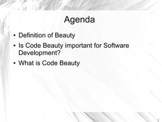 The document discusses different views of beauty throughout history and their application to code beauty. It provides definitions of beauty from ancient Greek, romantic, modernist, and post-modernist perspectives. The document then discusses how the Greek and modernist views of minimizing complexity and removing unnecessary elements can provide a good basis for code beauty. It defines code beauty as bringing pleasure to readers, making writers and collaboration happy, and leading to fewer bugs and better quality. Examples of beautiful code provided are the Smalltalk class collection for its elegant reuse of core implementation methods.
