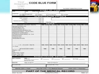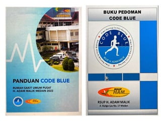 Dokumen ini membahas tentang sistem code blue di rumah sakit, termasuk proses penanganan kegawatan seperti henti jantung dan henti napas, serta pentingnya tim medis yang terlatih dalam melakukan resusitasi. Penekanan juga diberikan pada akreditasi rumah sakit dan perlunya sistem komunikasi yang efektif selama keadaan darurat. Penggunaan Early Warning Scoring System (EWSS) diharapkan dapat mengurangi jumlah panggilan code blue dan meningkatkan kesadaran petugas medis.
