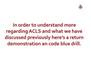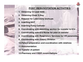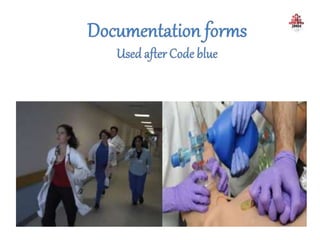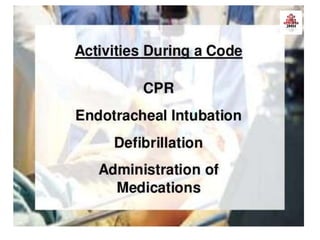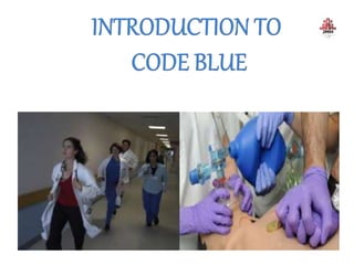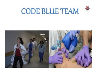 The document provides guidance on code blue management and response at Dr. Jayaharan Memorial Hospital, outlining the roles and responsibilities of the code blue team which includes a team leader, airway management, nurses, and others who will rush to the location of a cardiac or respiratory emergency to begin resuscitation efforts. The document also reviews code blue protocols, equipment, documentation, and termination of resuscitation efforts.