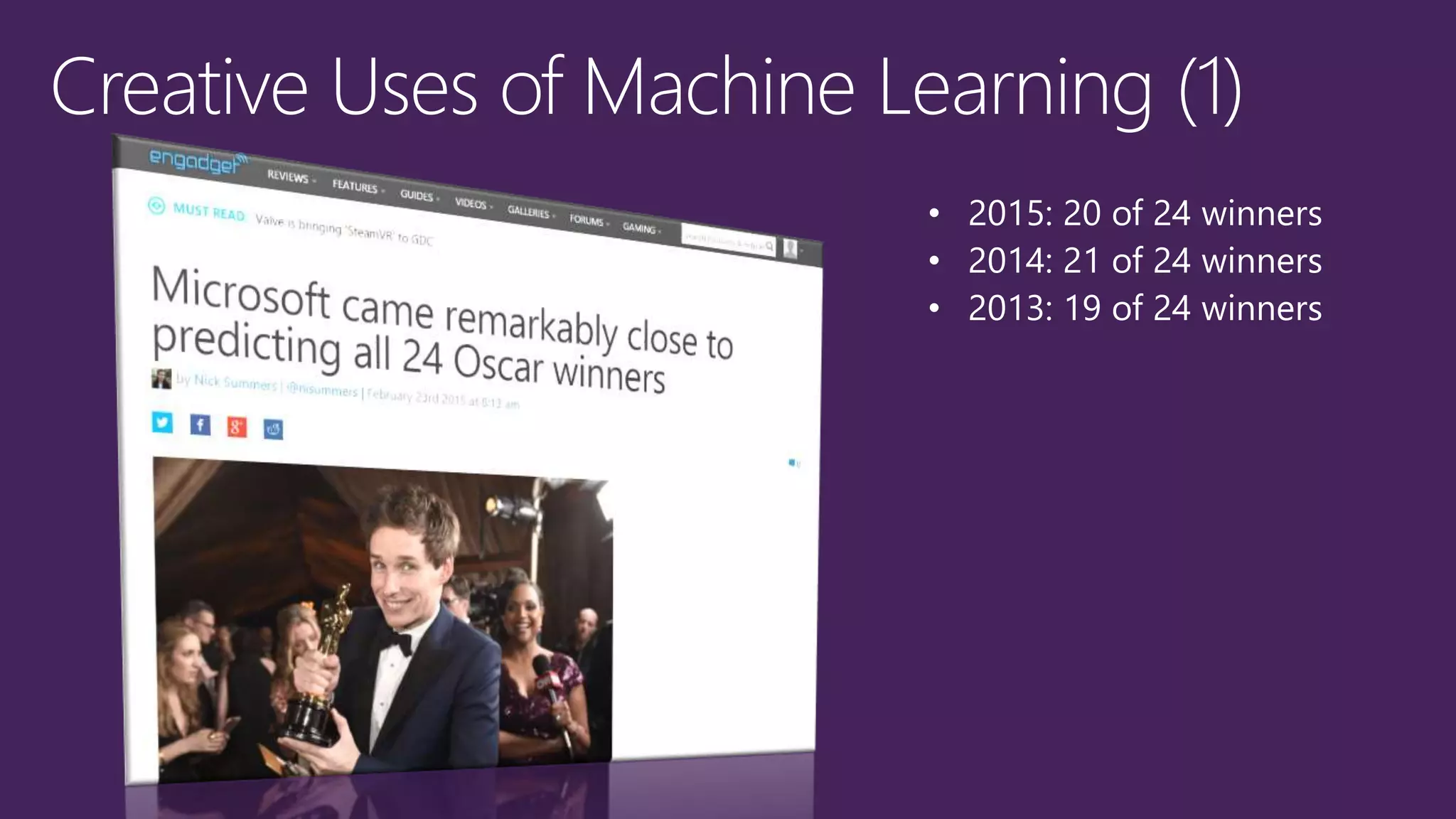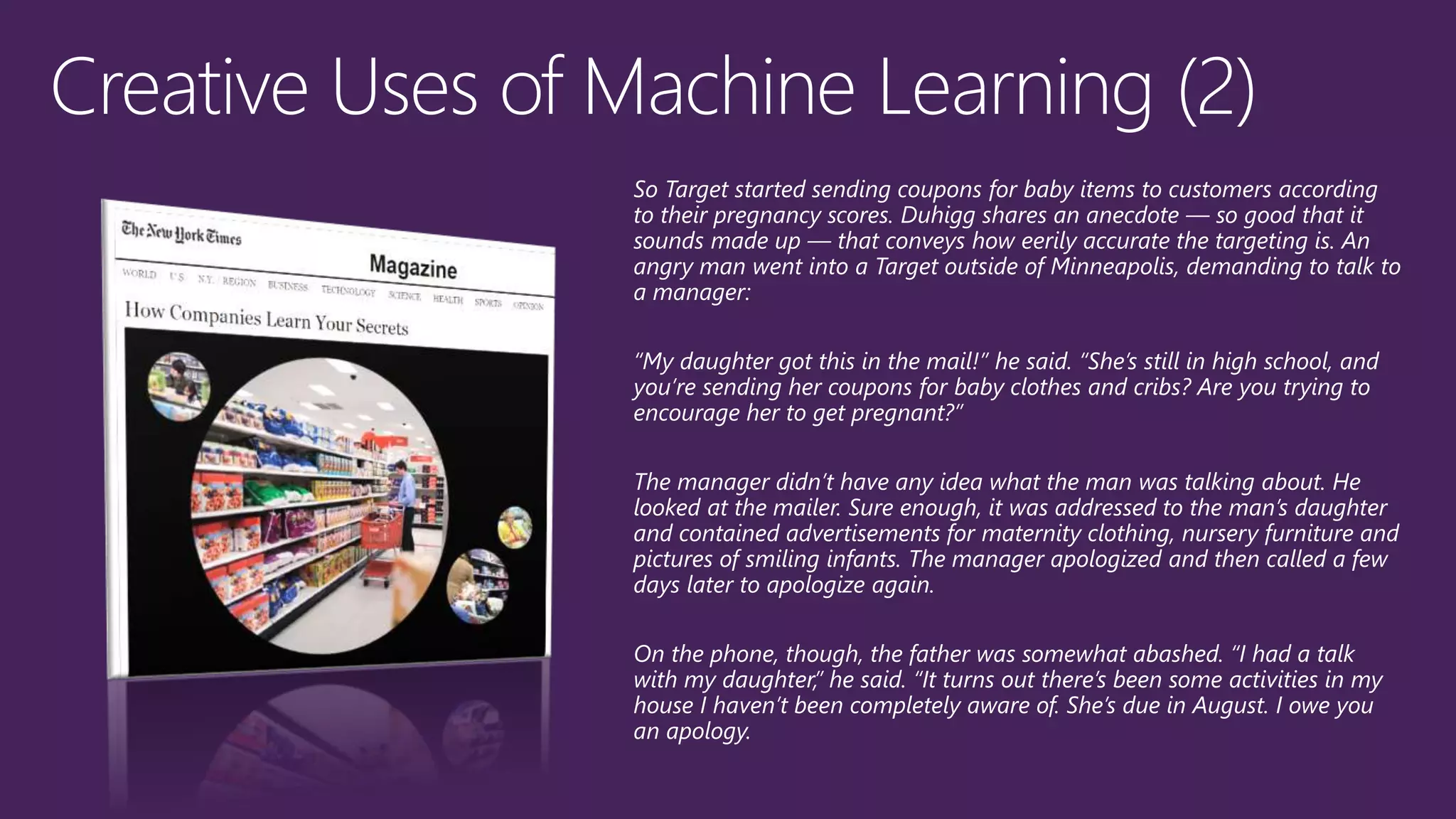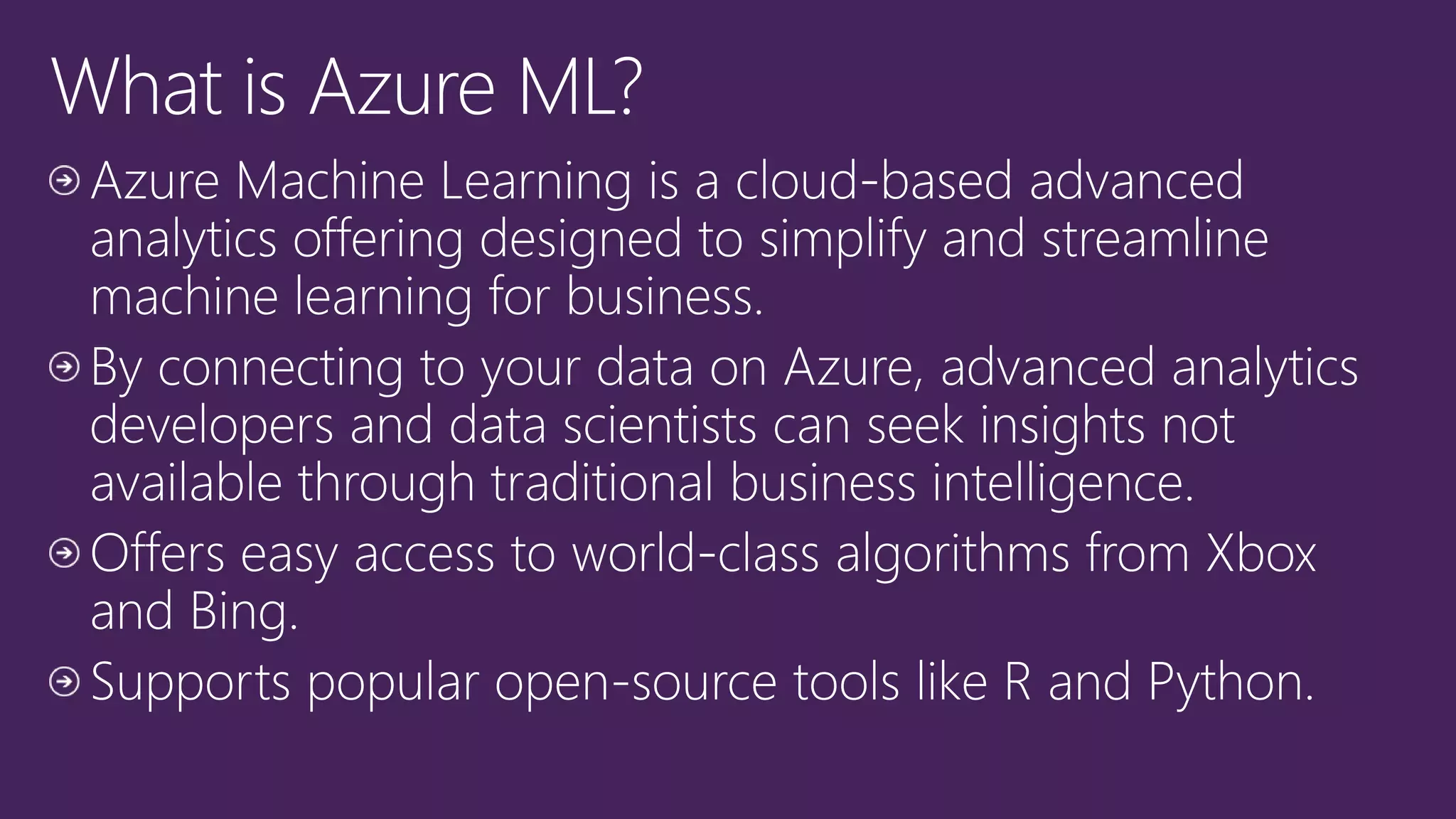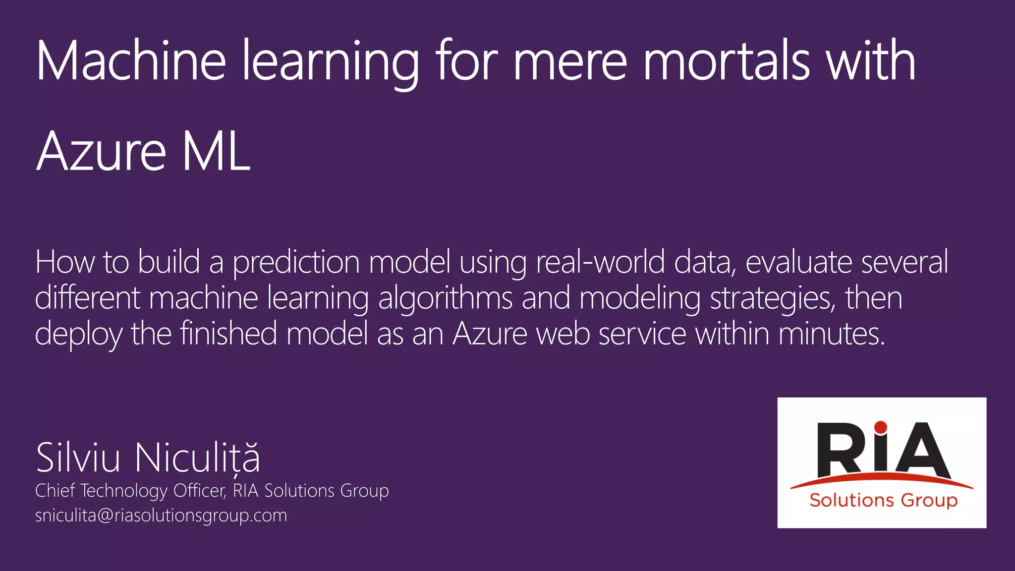 This document discusses how machine learning and predictive analytics are being used across many industries and business functions such as vision analytics, recommendation engines, advertising analysis, and fraud detection. It also discusses how data science workflows can be simplified to make machine learning more accessible and scalable. Key points include building and deploying machine learning models through a web browser without software installation, enabling collaborative work, and providing pre-built algorithms and the ability to deploy models as APIs.
