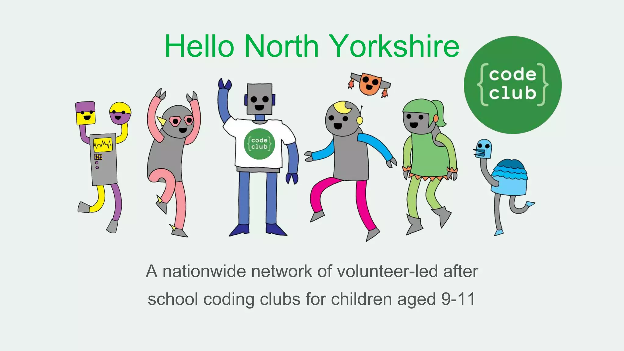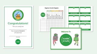 This document provides information about Code Club, a nationwide network of after school coding clubs for children aged 9-11. Code Club was founded in 2012 and uses a curriculum of coding projects to teach children computational thinking, problem solving, and collaboration. Volunteers lead the clubs and find teaching coding to be a rewarding experience that helps children's progress in other school subjects. The goal is for children to develop skills that will benefit their future education and careers. Information is provided on starting a new Code Club.