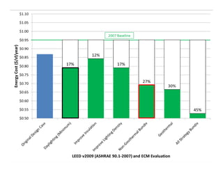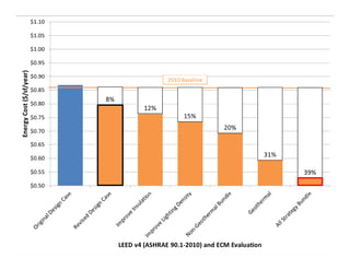 The document discusses the major changes in ASHRAE 90.1-2010 and their implications for energy modeling and LEED certification, highlighting the enhancements in building energy efficiency standards over the years. It emphasizes the need for design firms to educate clients about these evolving requirements and the importance of robust energy modeling to meet savings goals. Additionally, it details project specifications of the KJWW engineering consultants' expansion and outlines the associated costs and energy-saving strategies necessary for compliance with newer standards.